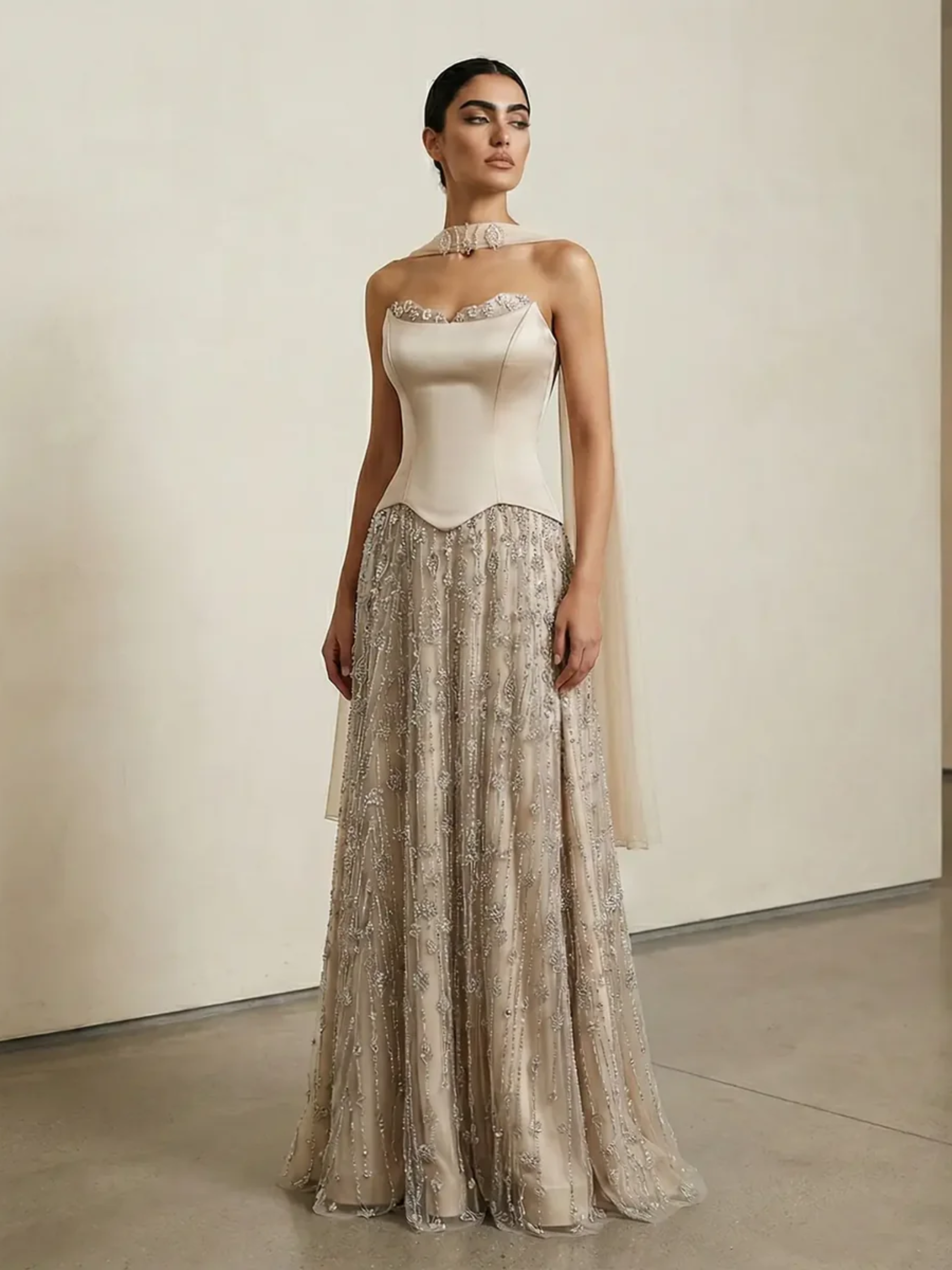 A refined gown featuring a structured strapless bodice with a softly sculpted neckline, complemented by an elegant scarf detail at the neck. Intricate crystal beading and embroidery cascade throughout the skirt, creating delicate texture and movement. The flowing skirt adds graceful volume, while the soft scarf detail enhances the overall elongated and refined silhouette.