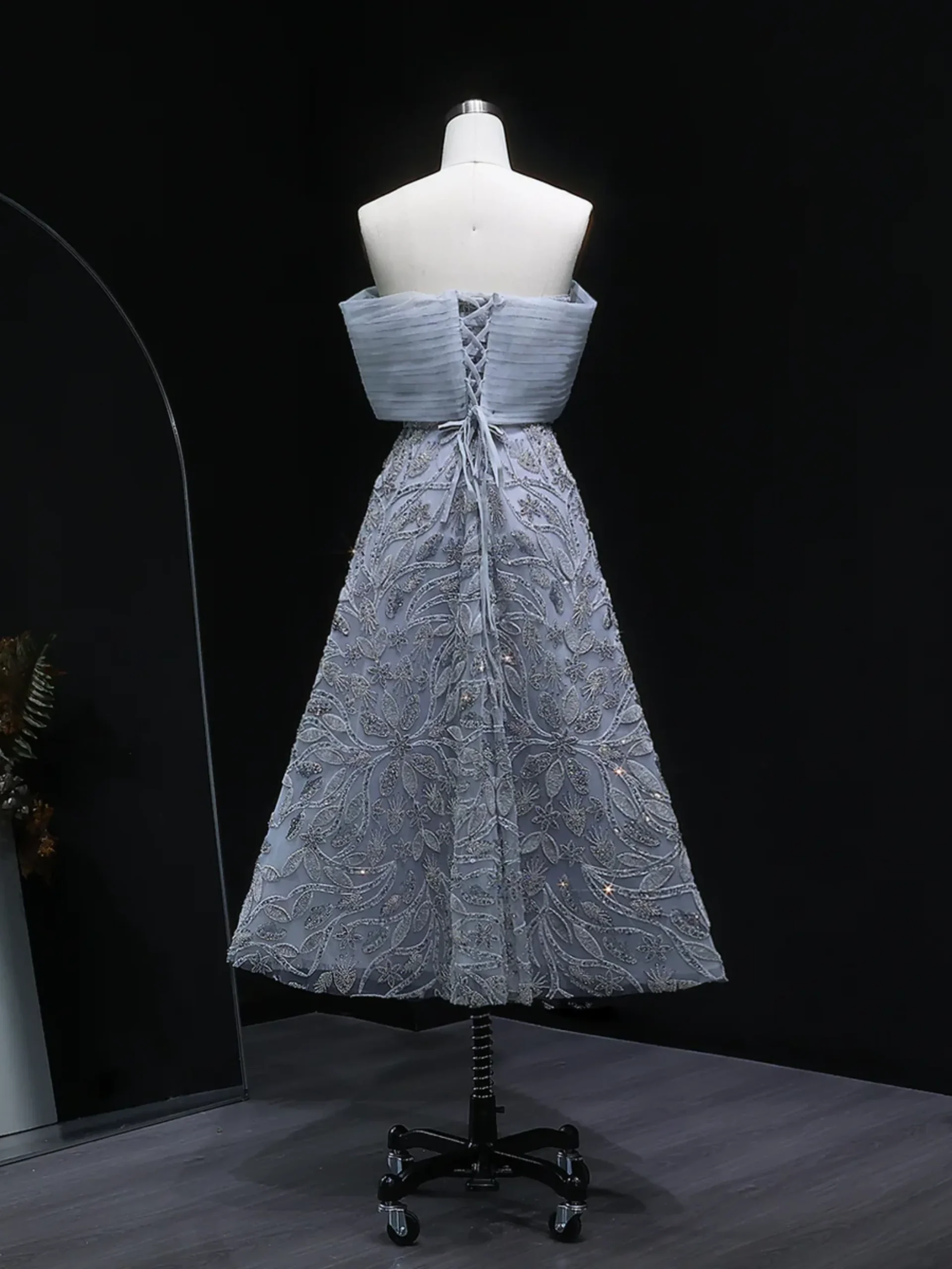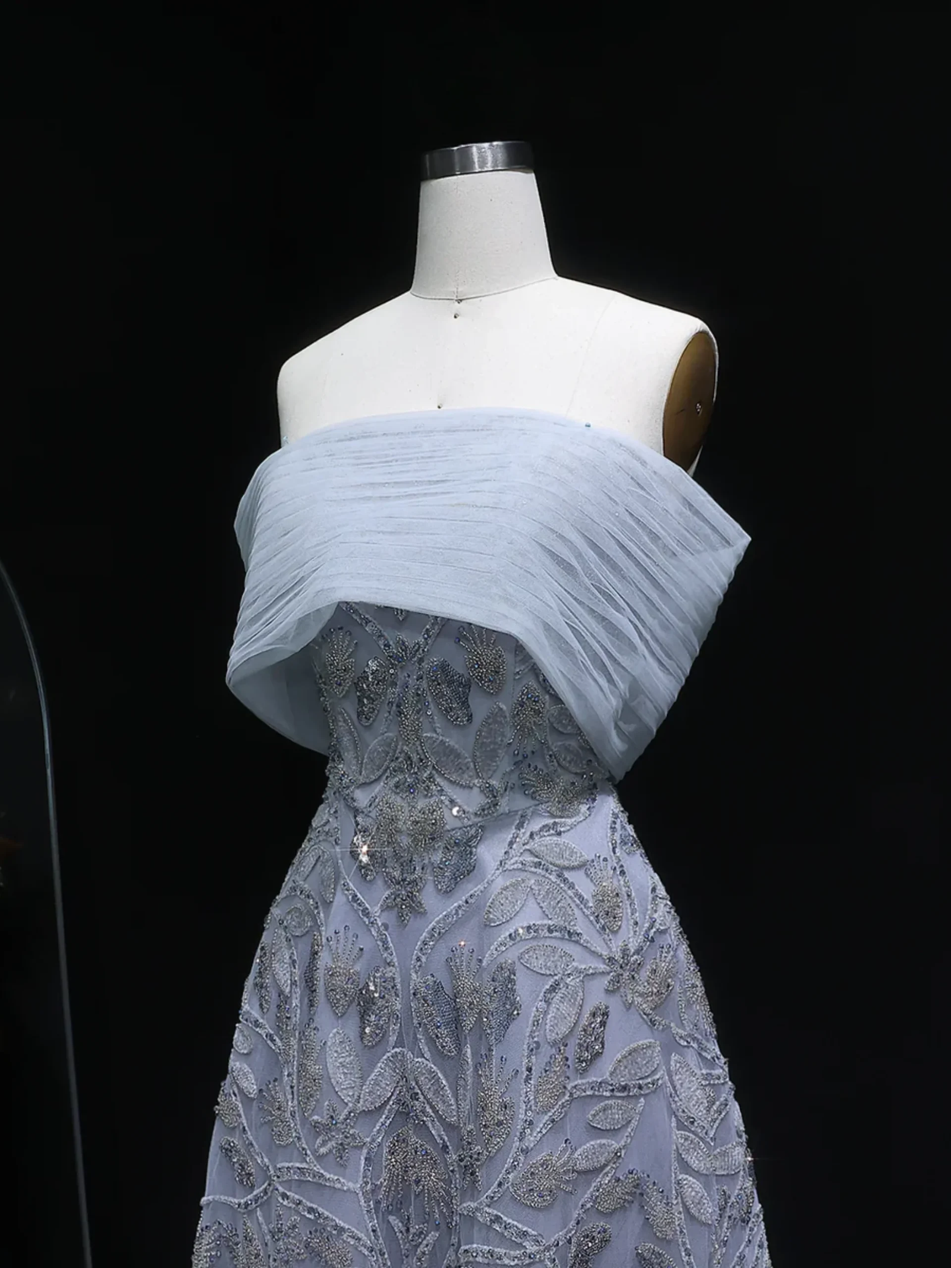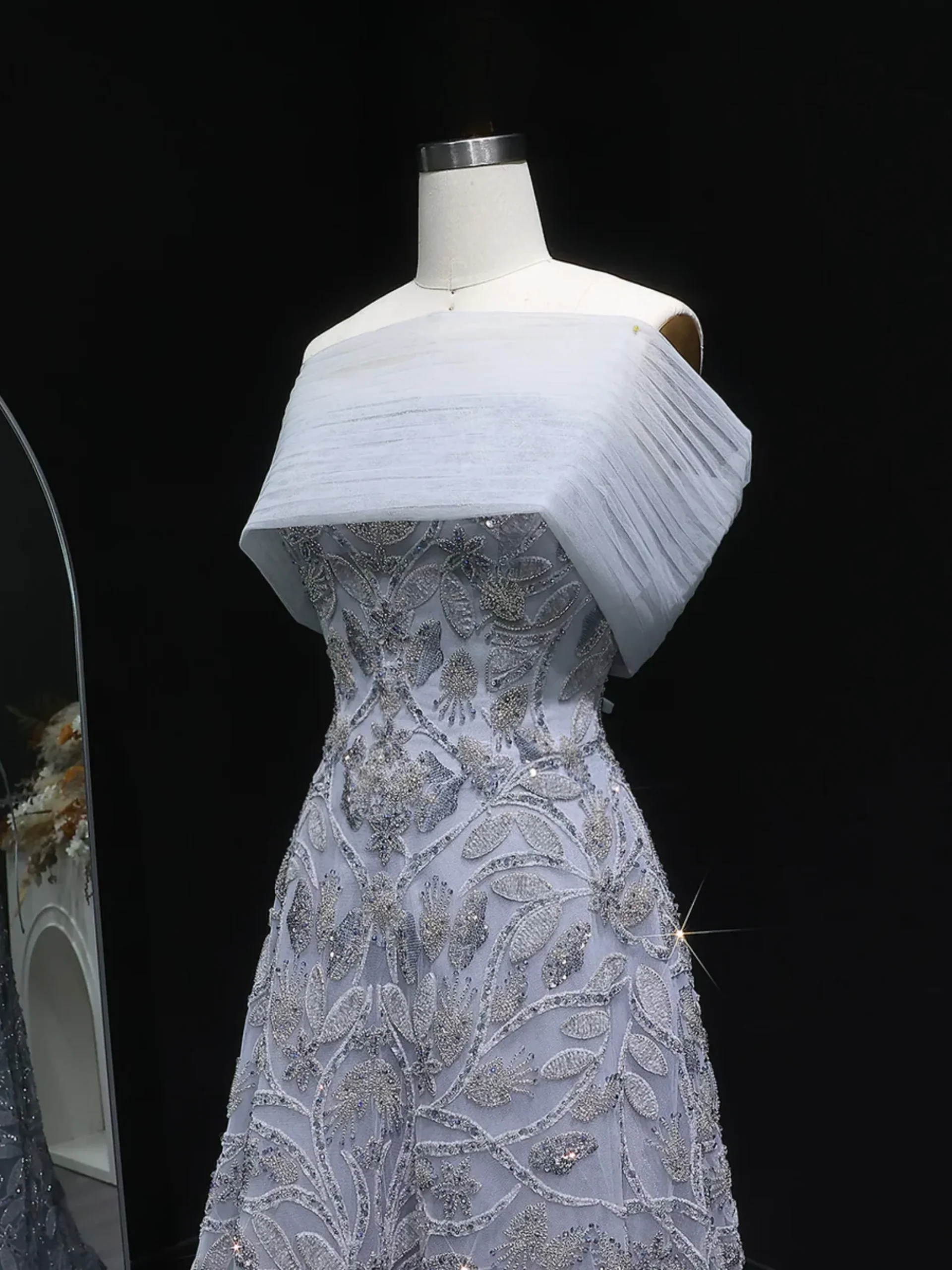 Sovereign Dream is an elegant A-line gown featuring intricate beaded embroidery throughout the bodice and skirt. The structured off the shoulder neckline with a folded collar detail creates a sculpted and refined silhouette. The full skirt flows gracefully, enhancing the dress’s timeless and balanced design.