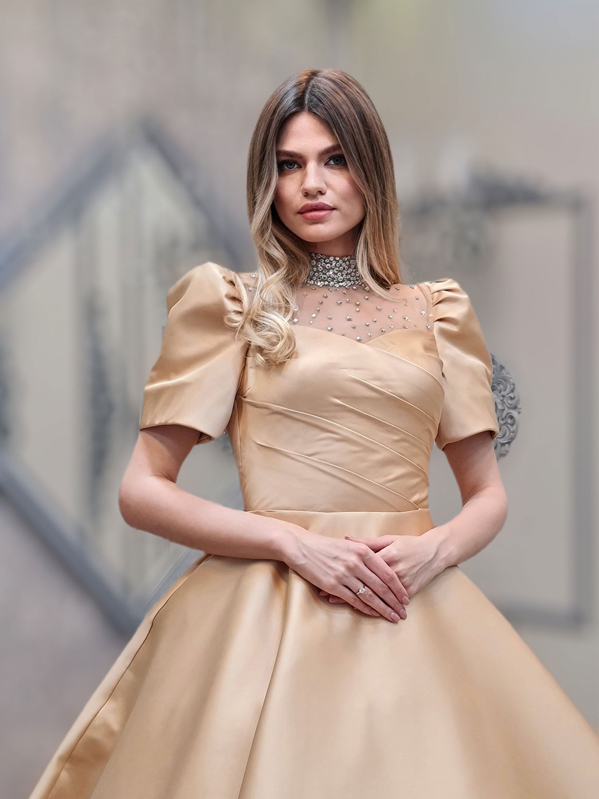 A graceful blend of timeless charm and modern sophistication, Golden Serenity radiates understated elegance. This gown features a delicate illusion neckline embellished with dainty pearls, giving a regal and refined touch. The soft short sleeves with subtle gathers add a vintage-inspired feel, while the asymmetrical pleating across the bodice enhances the architectural finesse of the design.